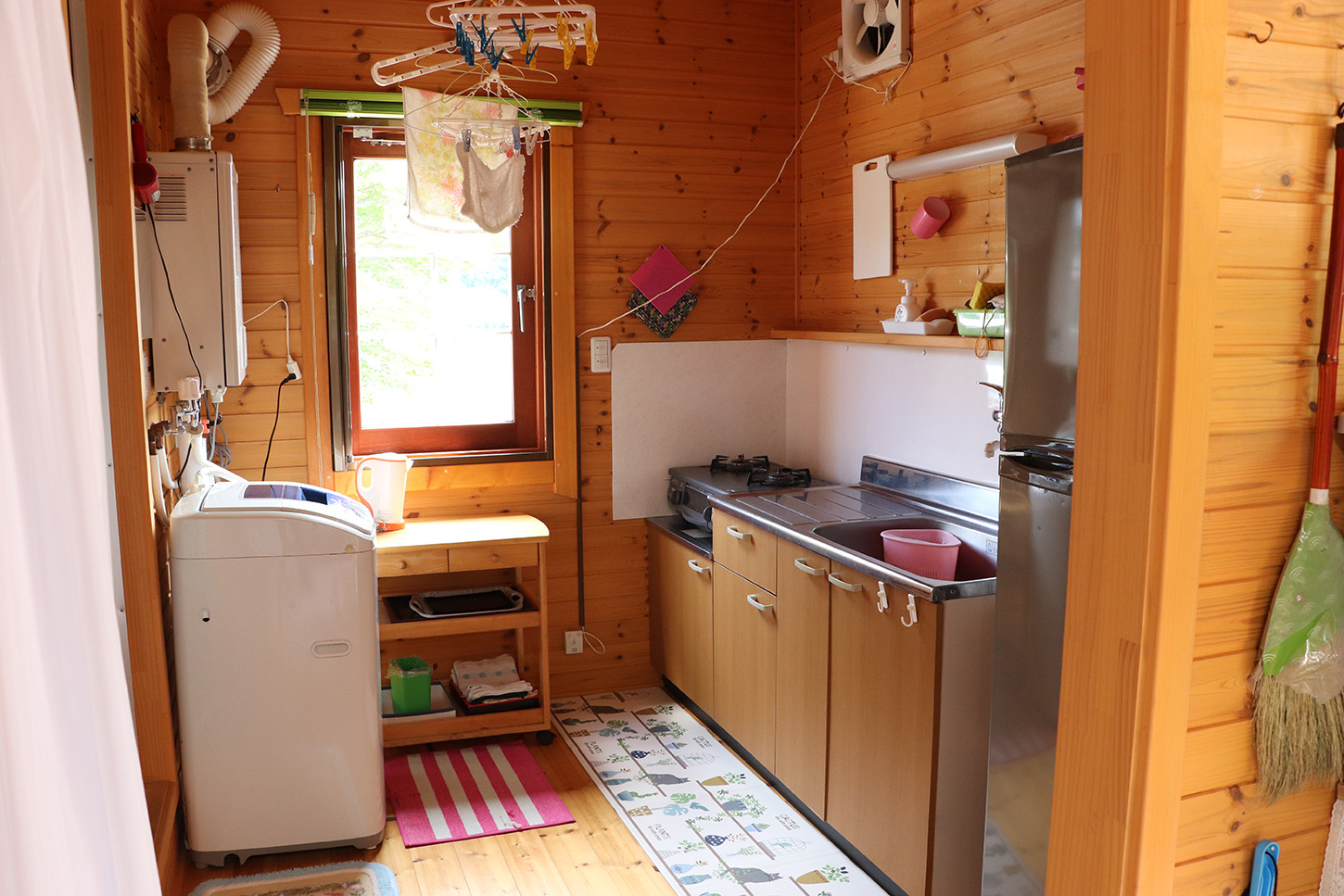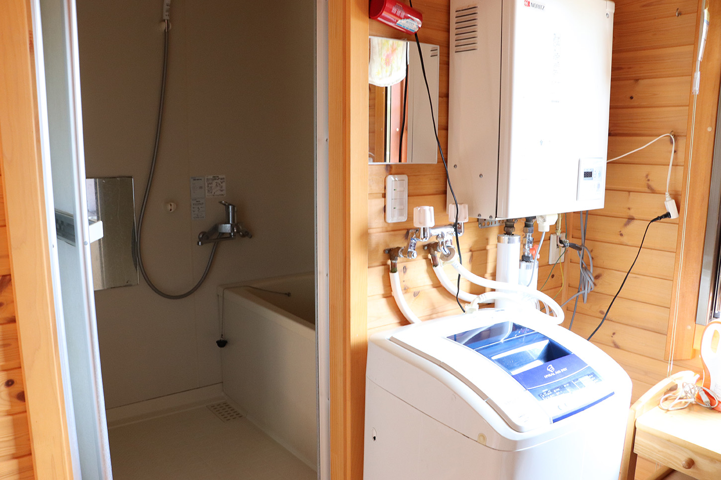 冷蔵庫、テレビ、電子レンジ、炊飯器、電気ポット、トースター、扇風機、ソファ、テーブル、食器、ストーブ、台所用調理器具一式、簡易トイレ、風呂、エアコン